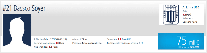 La joya aliancista tiene una cotización en el mercado internacional de 75 mil euros, lo que en soles daría un promedio de 280 mil, según el portal especializado ´ Transfermarkt ´. Está claro que recién está dando sus primeros pasos en la primera división, pero con la presencia que tuvo en el Estadio Mansiche de Trujillo y con lo que mostró en los minutos que ingresó al campo de juego, no hay que perder de vista que en un El futuro cercano podría ser de mayor utilidad.